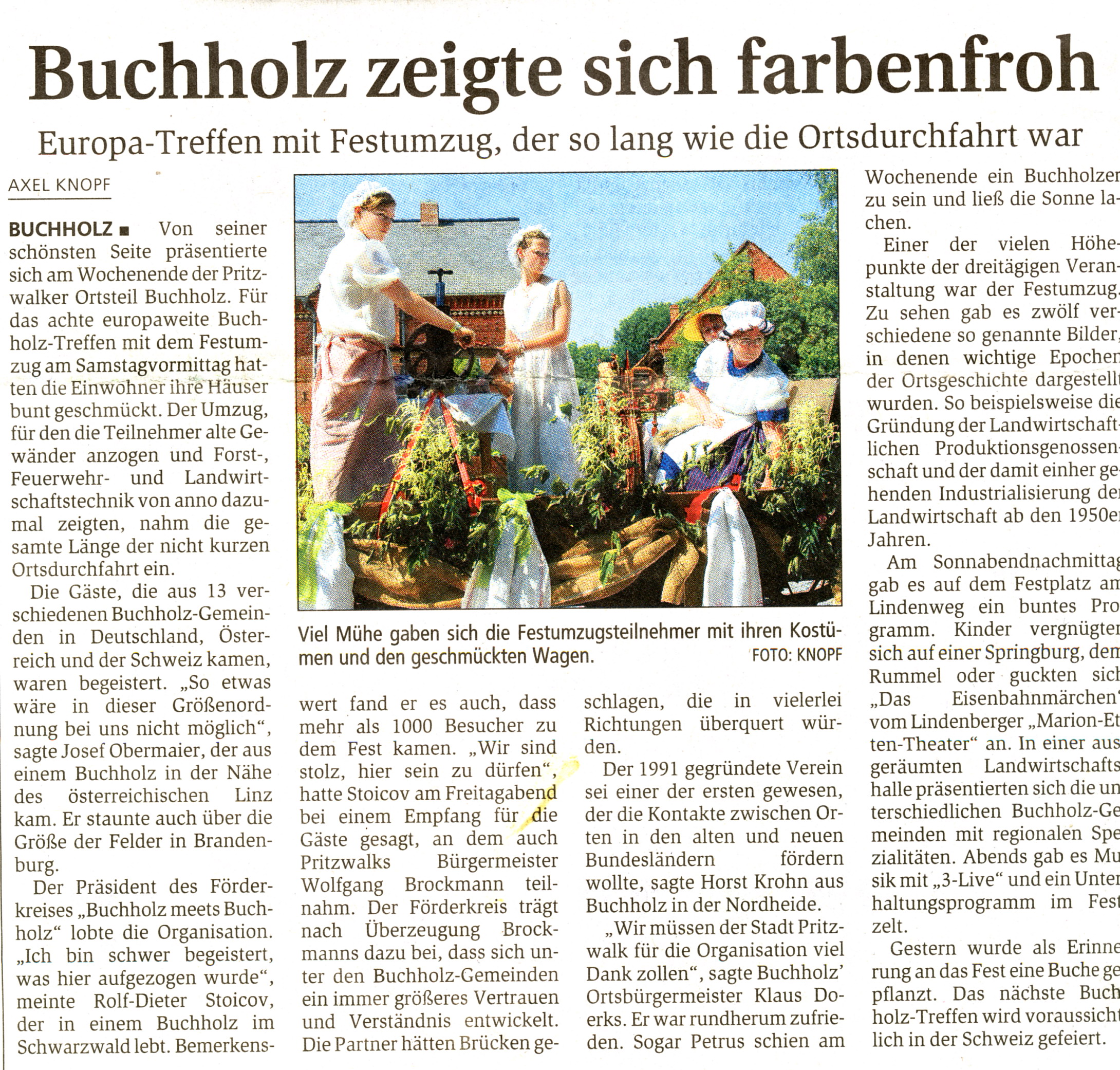 Anschließend wurde nahe der Kirche die schon traditionelle Buchholz - Buche gepflanzt. Danach spielten zum Frühschoppen die Locknitztaler Musikanten und Iris Lentjes, bekannt durch Funk und Fernsehen, begeisterte durch stimmungsvolle Schlager und Volksmusikvorträge. Gegen 13.00 Uhr wurden die Buchholzer Gäste offiziell vom Bürgermeister Wolfgang Brockmann und vom Ortsbürgermeister Klaus Doerks verabschiedet.