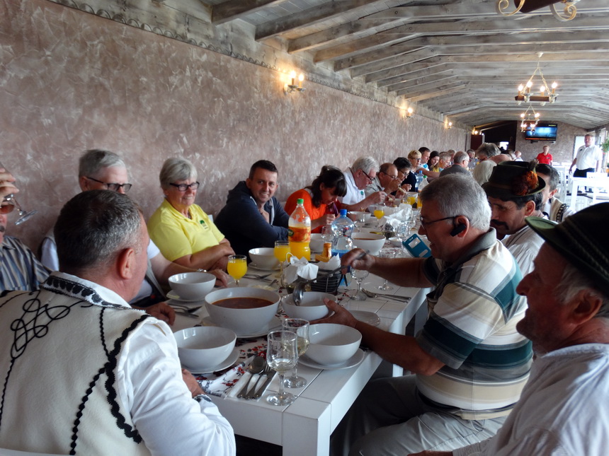 50 Rumänienreisende machten sich Freitagmittag auf dem Weg nach Deva. Nach dem Einchecken im Hotel zogen sich alle um, die Damen im roten Poloshirt mit dem Vereinsemblem und die Herren im weißen Poloshirt mit dem Vereinsemblem. Nun ging es per Bus weiter nach Soimus. Hier wurden wir vom Bürgermeister Irimie und vom Boholter Ioan Ruja empfangen.