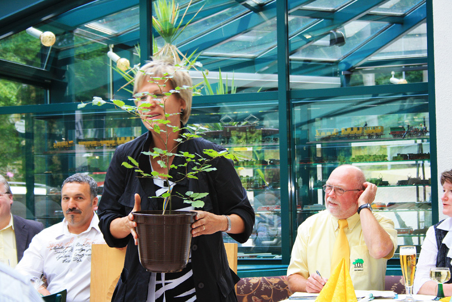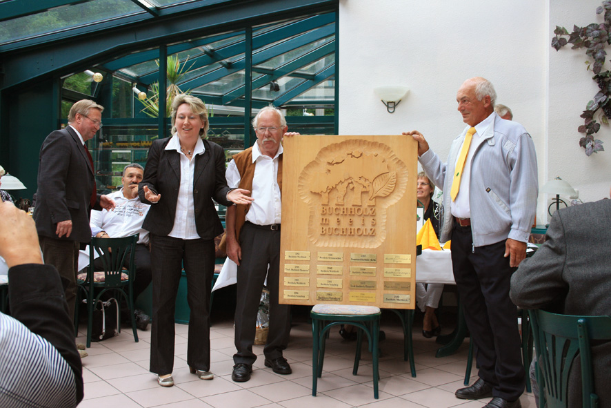 Danach übergeben die Buchholzerinnen und Buchholzer aus Buchholz/ Waldkirch die Wandertafel an Fredi Petzold als Vertreter von Annaberg – Buchholz, Frau Kleeb sagt dazu, dass sie in Buchholz/ Waldkirch die Tafel in der Zeit lieb gewonnen hätten und auch einen Kosenamen dafür vergeben  Fredi Petzold bedankt für das Geschenk und sagt, dass er sich besonders darüber freut, dass die Wandertafel nunmehr nach Annaberg – Buchholz, an ihren Ausgangsort, zurück gekehrt sei. Nun ergreift die Oberbürgermeister, Frau Klepsch, das Wort. Sie begrüßt alle angereisten Buchholzerinnen und