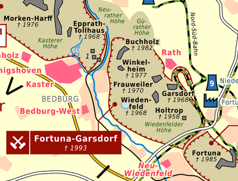 Bedburg; Blerichen; Broich; Kaster mit umgesiedelten Ortschaften wie Morken-Harff; Kirchherten mit Grottenherten;