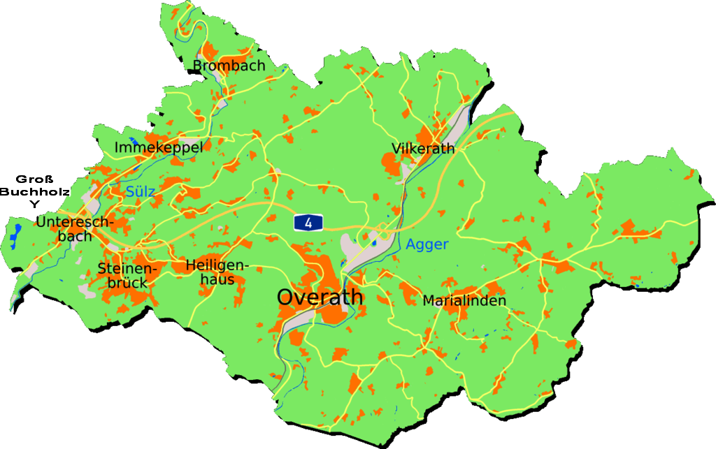 Neben dem Hauptort mit etwa 8000 Einwohnern gehören zur Stadt Overath folgende Stadtteile: