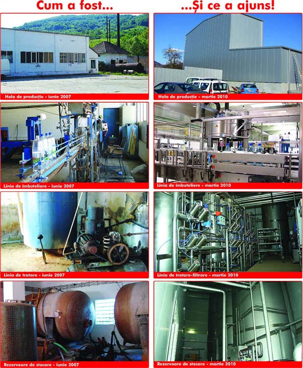 Während aufgrund der Finanzkrise tausende Unternehmen im ganzen Land geschlossen wurden bzw. ihre Produktion einschränkten und nicht mehr investierten, entschloss sich ein Investor aus Hunedoara genau für das Gegenteil. Horia Daniel Faur, Präsident der Quasar Group, investierte über fünf Millionen Euro und modernisierte in Boholt in eine hochmoderne Mineralwasserabfüllanlage. Siehe hierzu die nachfolgenden Bilder.