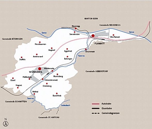 Wünnewil, Flamatt, Oberflamatt, Sensebrücke, Eggelried, Balsingen, Bagewil, Amtmerswil, Staffels, Pfaffenholz, Elswil,