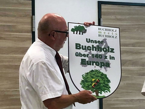 Helmut Mai zeigte dann, mit einiger Verspätung nach dem Pflanzen der Buche, Bilder und ein Fernsehvideo vom letzten Buchholz – Treffen in Boholt/ Soimus Rumänien. Außerdem stellte er ein neues „Buchholzschild“ vor, das allgemein gefiel. Der Bürgermeister Irimie lud die Buchholzer zum Buchholz – Treffen 2021 nach Rumänien ein und Gaby Schrader lud alle Buchholzer zum Treffen 2019 nach Hannover Groß Buchholz ein.
